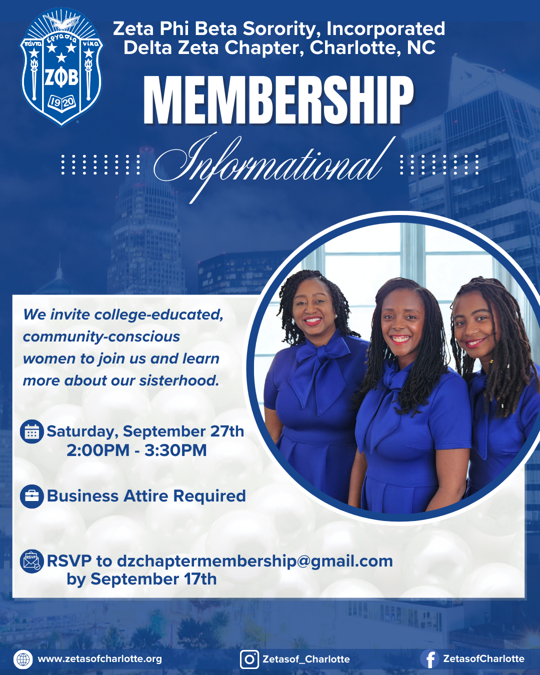 Discover the power of sisterhood and leadership with Zeta Phi Beta Sorority, Inc., Delta Zeta Chapter, proudly serving the Charlotte community since 1934. We welcome college-educated women who are eager to make a difference. Join us for our upcoming information session. RSVP today to connect and learn more!