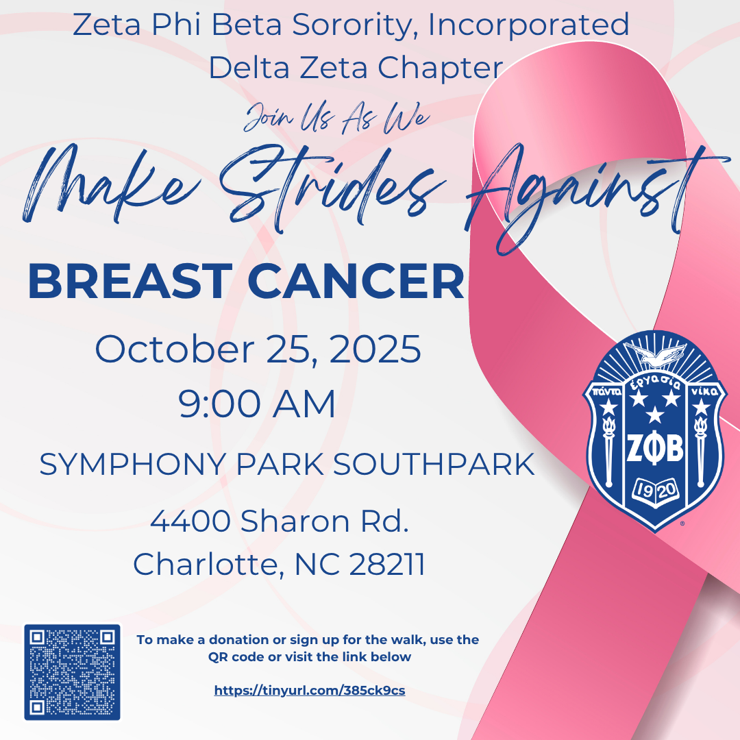 Together, we can make a difference! Join the Zeta Phi Beta Sorority, Inc., Delta Zeta Chapter as we continue to make strides against breast cancer. Let’s unite in the fight and show our support on October 25, 2025!
